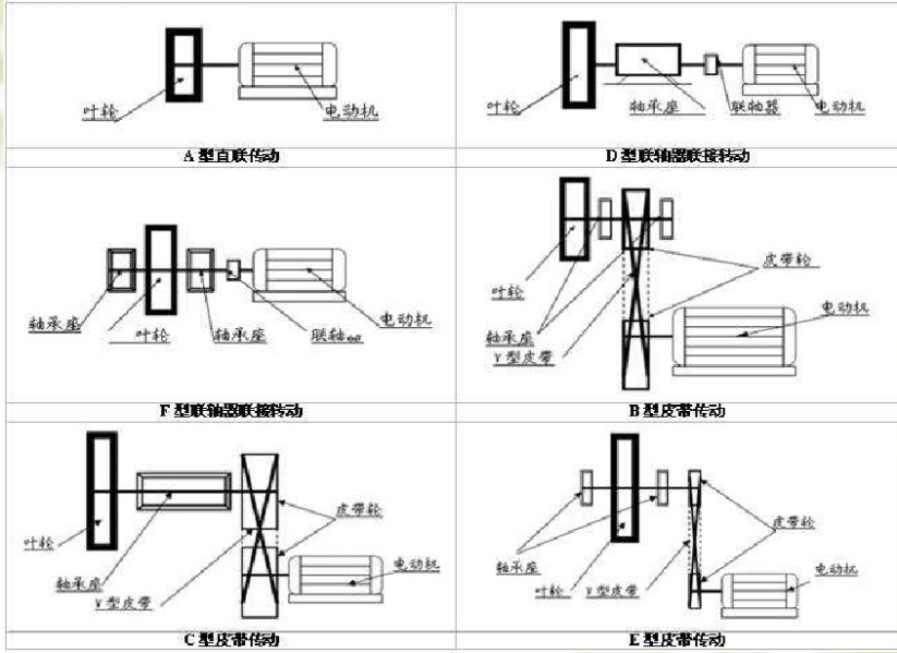 皮帶傳動(dòng)型,通過皮帶和皮帶輪驅(qū)動(dòng)的風(fēng)機(jī)。B式,皮帶輪在兩軸承中間,葉輪懸臂安裝;C式,皮帶輪懸臂安裝在軸的一端,葉輪懸臂安裝在軸的另一端;E式皮帶輪懸臂安裝,葉輪安裝在兩軸承之間。