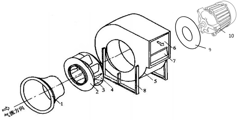 1、進(jìn)風(fēng)口 2、前盤 3、葉片 4、后盤 5、機(jī)殼 6、出風(fēng)口 7、節(jié)流板(風(fēng)舌) 8、支架 9、擋板 10、電機(jī)