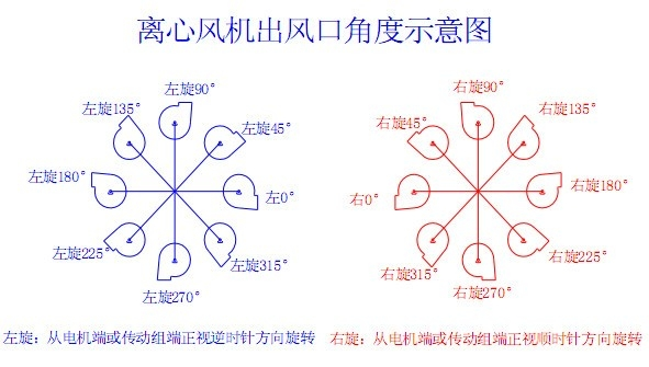 4、一般4-72離心式通風(fēng)機(jī)產(chǎn)品標(biāo)準(zhǔn)出風(fēng)口角度為0°、90°、180°三種。